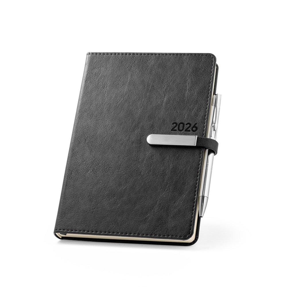 Agenda A5 em PU, com fecho magnético e peça metálica brilhante. Possui um suporte para esferográfica (inclusa) e marcador em fita. Está organizada num plano diário. Fornecida com bolsa de non-woven