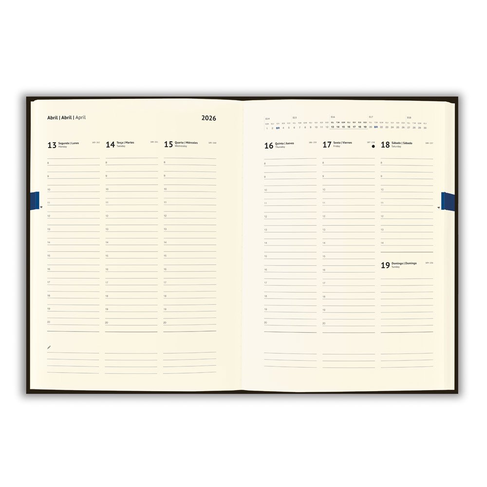 Agenda B5 em cortiça com suporte para esferográfica (não inclusa), miolo em cor de marfim e marcador em fita. Está organizada num plano semanal. Fornecida com bolsa de non-woven
