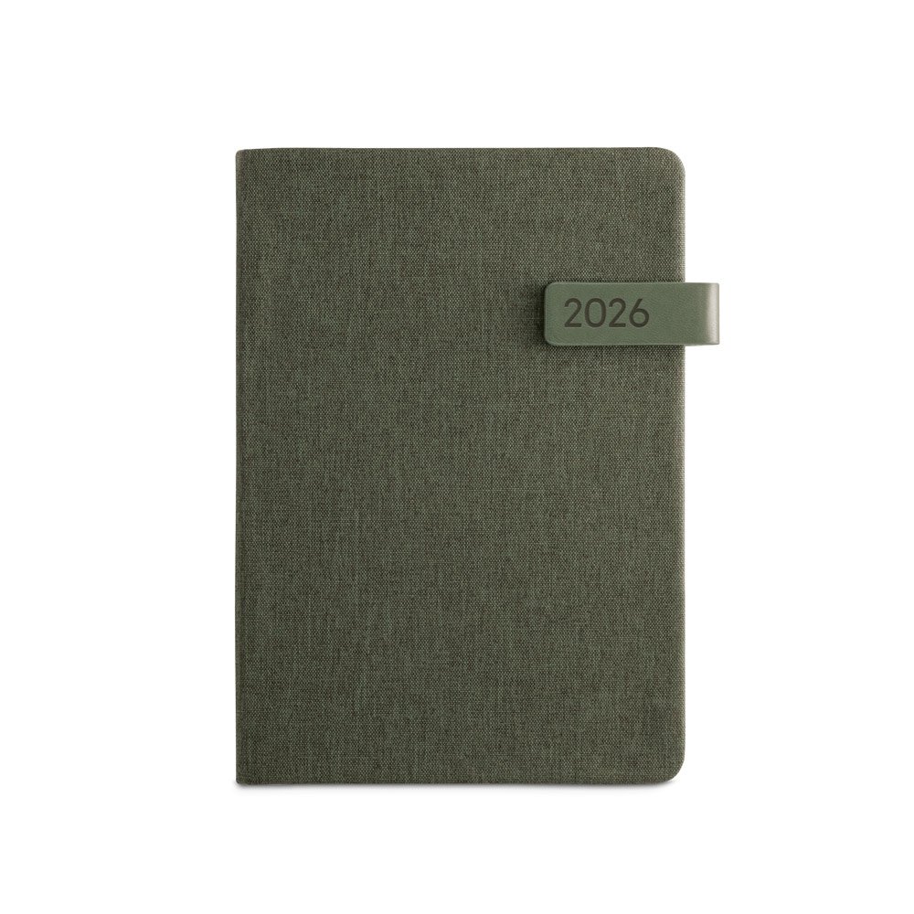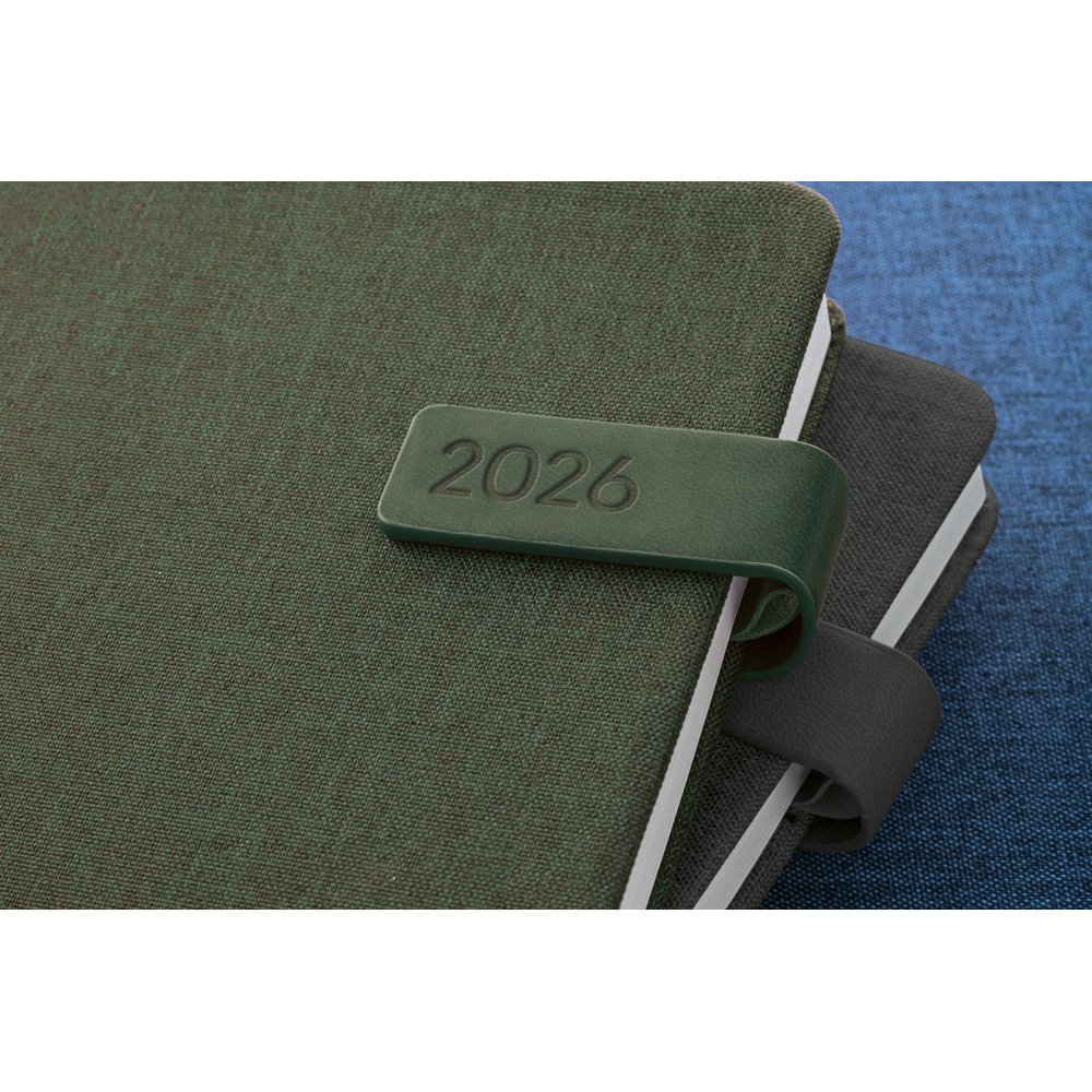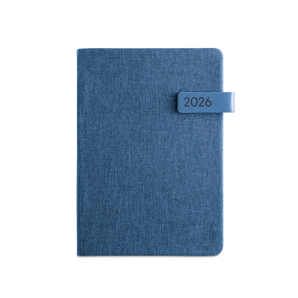 Agenda A5 em PET reciclado (100% rPET), com fecho magnético em PU. Possui um marcador em fita e suporte para esferográfica (não inclusa). Está organizada num plano diário. Fornecida com bolsa de non-woven