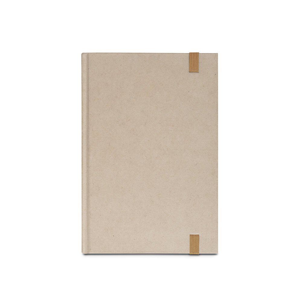 Caderno A5 de capa dura em papel à base de cana-de-açúcar (80% polpa da cana-de-açúcar). Contém 160 páginas pautadas em papel à base de cana-de-açúcar (80% polpa da cana-de-açúcar) (90 g/m²), fita separadora e elástico para fecho do bloco