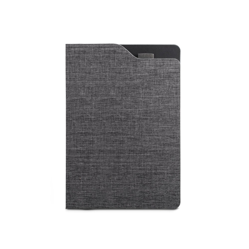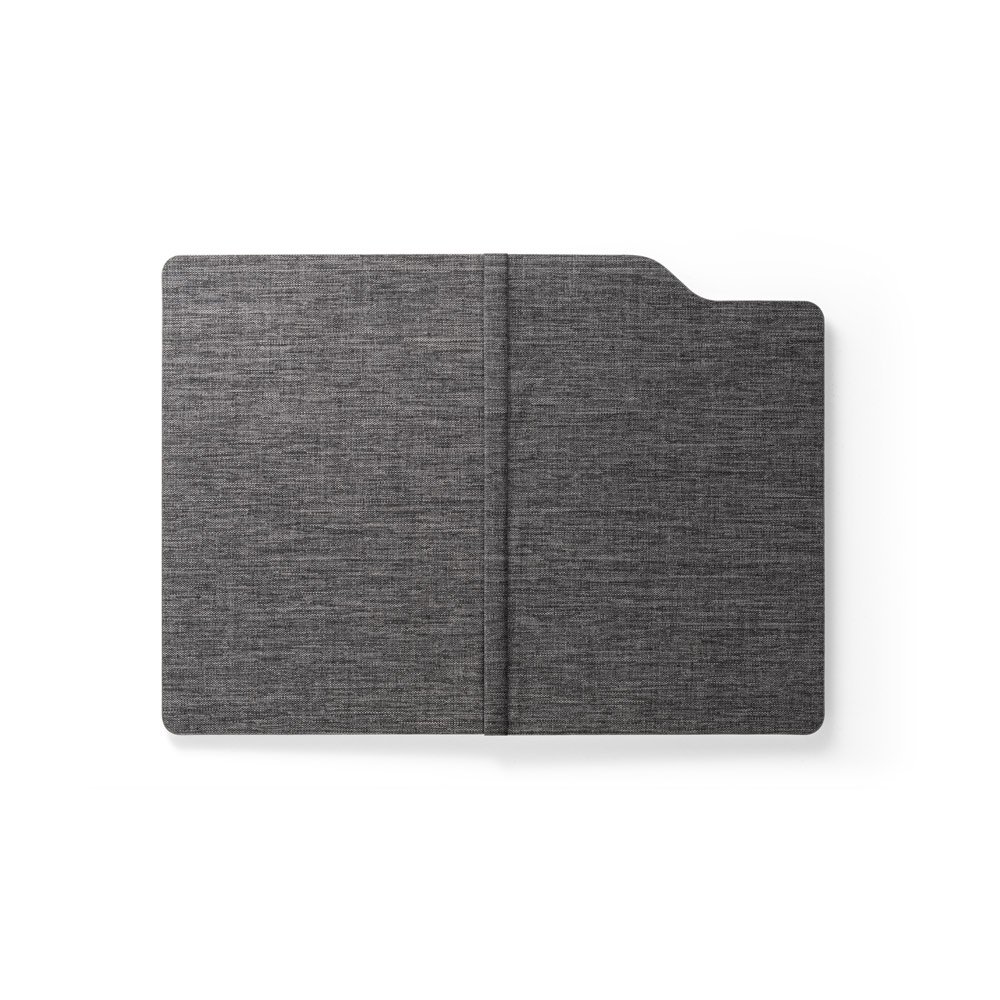 Caderno A5 de capa dura em tecido PET 100% reciclado (rPET). Contém 160 páginas pautadas em papel cor marfim 100% reciclado, fita separadora e suporte de esferográficas no topo do caderno (não inclusa)