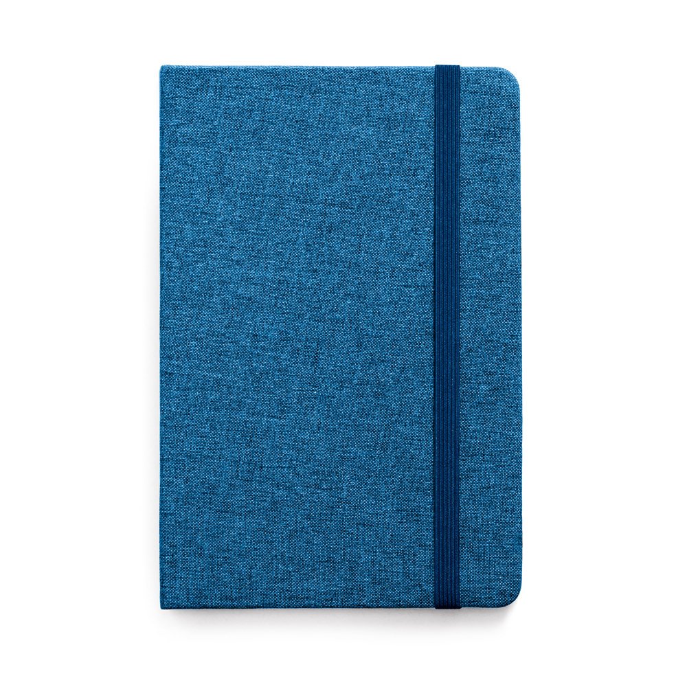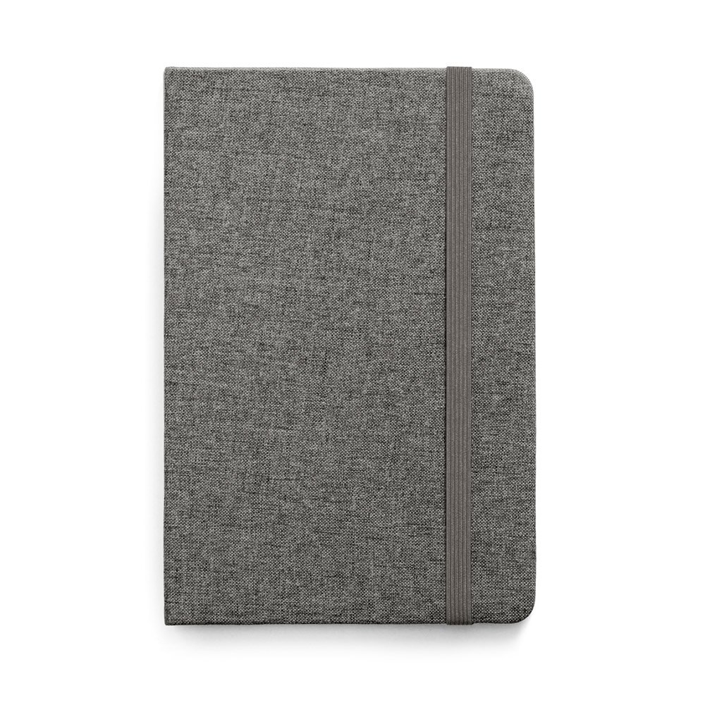 Caderno A5 com capa dura forrada em tecido poliéster e 160 páginas pautadas em cor marfim. Contém elástico e fita separadora