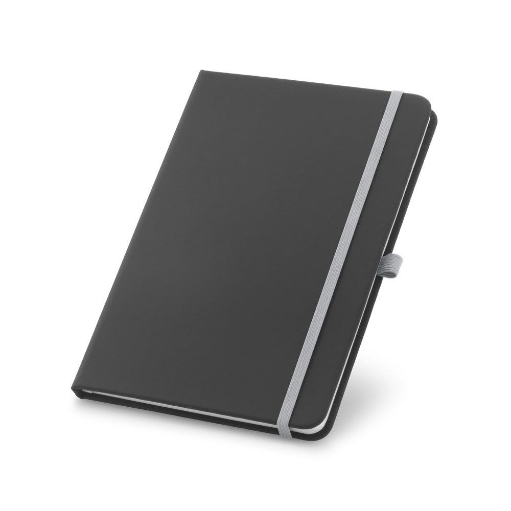 Caderno A6 de capa dura em c. sintético. Contém 160 páginas pautadas, fita separadora, elástico e suporte para esferográfica (não inclusa). 90 x 140 mm