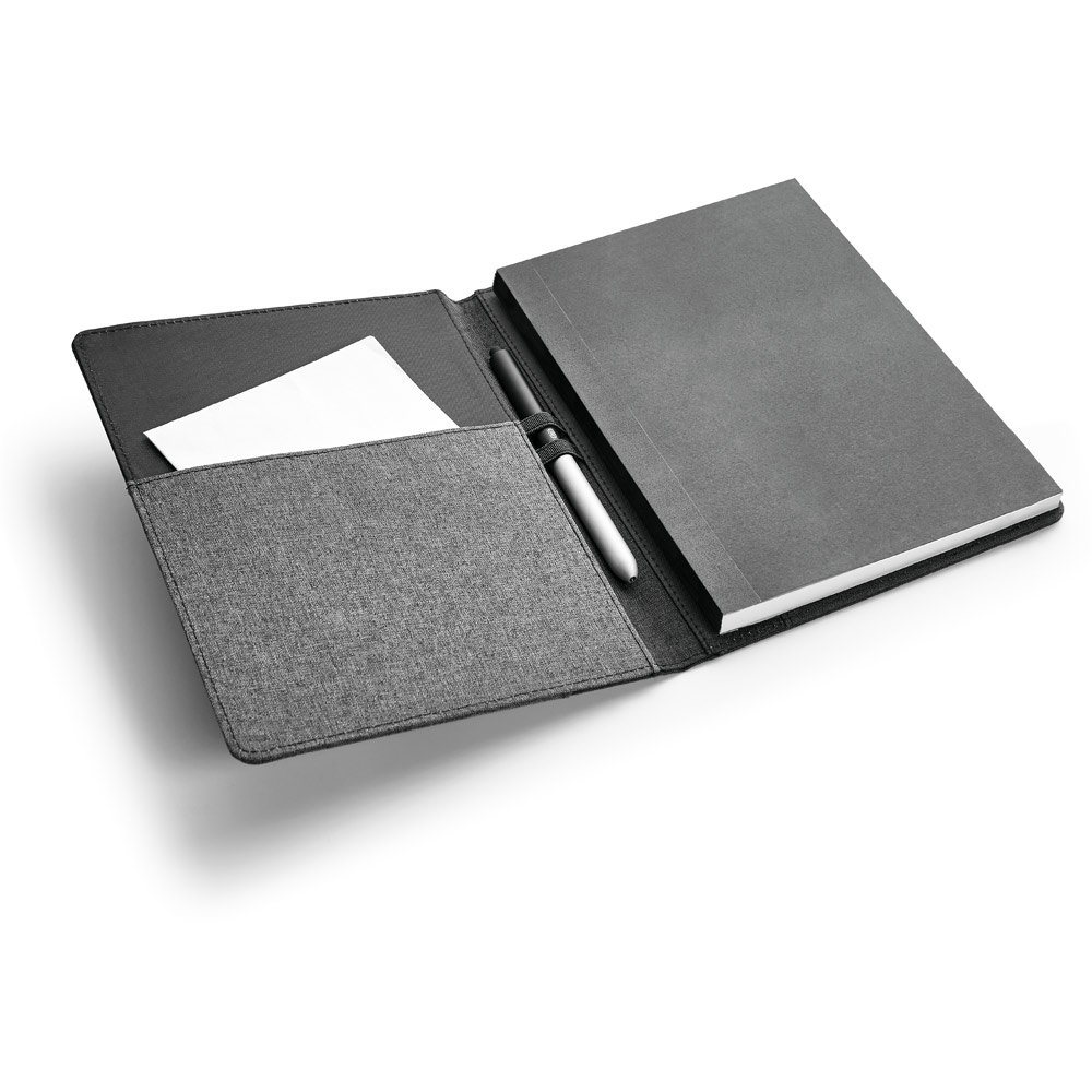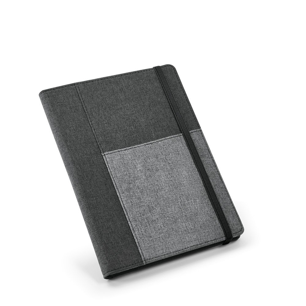 Capa de tecido em poliéster, com caderno A5 removível com 160 páginas lisas. O interior contém um bolso interior e suporte para esferográfica (não inclusa). Fornecida em embalagem de non-woven
