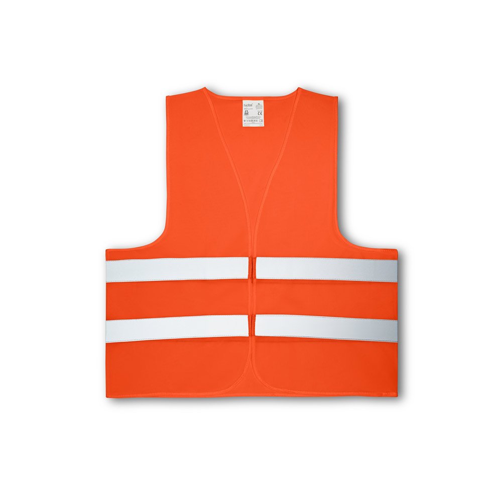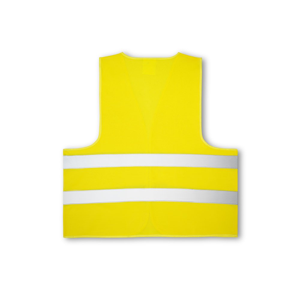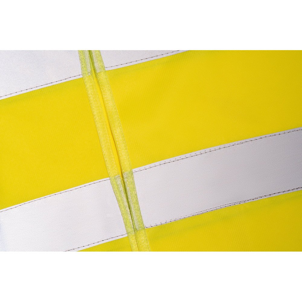 Colete de alta visibilidade em poliéster, com certificado pela norma EN ISO 20471 classe 2. Colete refletivo com 2 bandas refletoras horizontais e abertura frontal com fecho aderente. Tamanho único: 670 x 700 mm