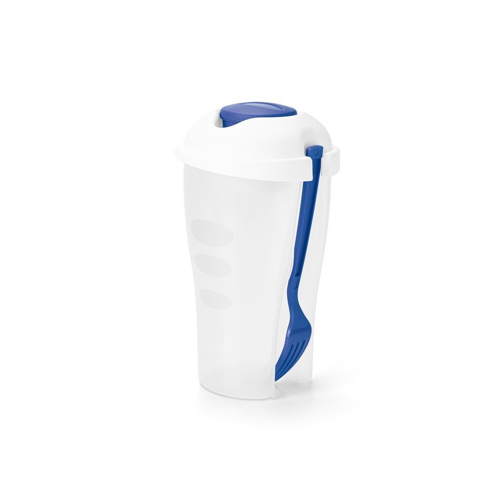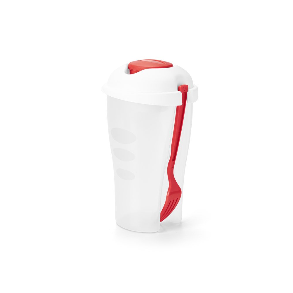 Copo para salada em PP com garfo e molheira. Capacidade até 850 mL. Apto para micro-ondas, retirando a tampa. Caixa branca 94659 vendida opcionalmente. Certificação EU Food Grade