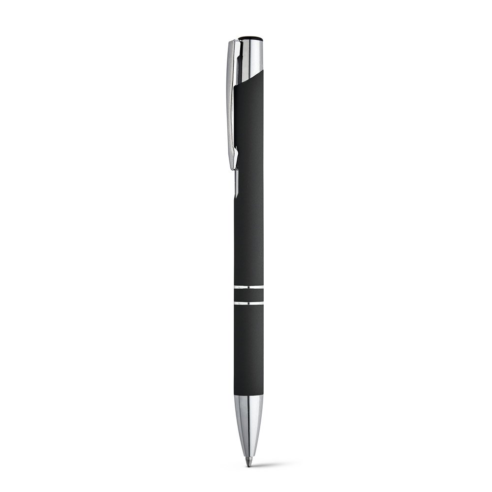 Esferográfica em alumínio com acabamento emborrachado e clipe de metal. Escrita em preto até 1.5 km. ø10 x 137 mm
