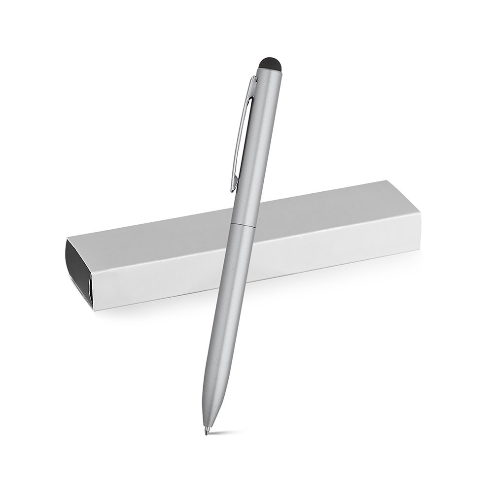 Esferográfica em alumínio com clipe de metal. A esferográfica tem mecanismo twist, ponteira touch em silicone e escrita em azul até 1,5 km. Fornecido em caixa presente desmontada