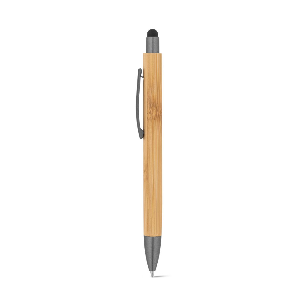 Esferográfica em bambu com clipe em metal e acabamento mate. A esferográfica tem ponteira touch e escrita em preto até 1.5 km. A cor e o resultado da impressão nos materiais naturais pode variar entre produtos. Ø11 x 141 mm