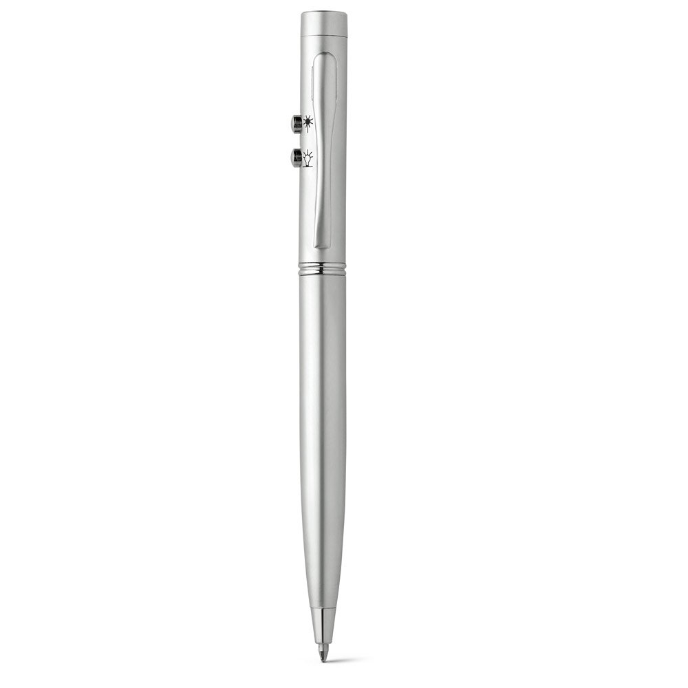 Esferográfica em metal com ponteira laser, LED e escrita em azul