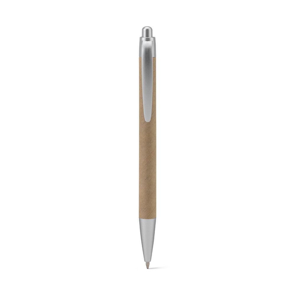 Esferográfica em papel 100% reciclado e detalhes em ABS 100% reciclado. A esferográfica tem clipe e escrita em azul até 1,5 km. Uma esferográfica com materiais reciclados para dar destaque à sua marca. A cor e o resultado da impressão nos materiais naturais pode variar entre produtos