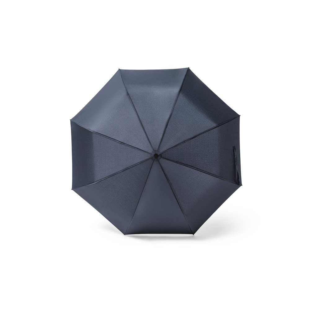 Guarda-chuva de 23” em poliéster 100% reciclado pongee 190T, com varetas em fibra de vidro, haste metálica e pega em ABS 35% reciclado. O guarda-chuva, dobrável em 3 seções, tem abertura e fecho automático e é à prova de vento. Fornecido em bolsa. ø1050 x 330 mm | Sacola: ø50 x 250 mm