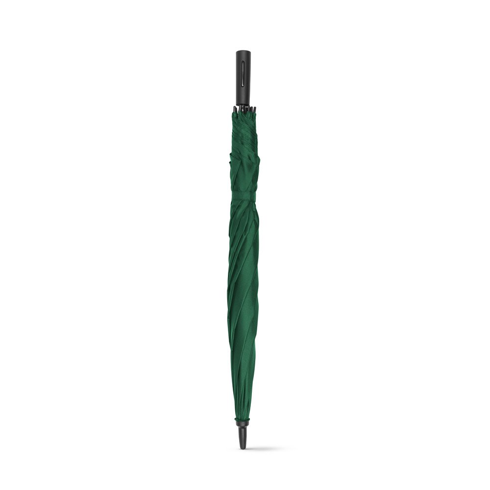 Guarda-chuva em poliéster pongee 190T, com haste e varetas em fibra de vidro e pega em PP. O guarda-chuva tem abertura automática e é à prova de vento. Fornecido em bolsa
