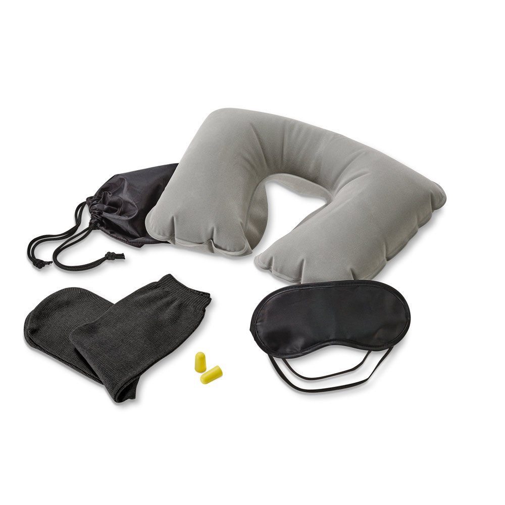 Conjunto de viagem composto por almofada de pescoço, máscara para dormir, tampões para ouvidos (não é um equipamento de proteção individual) e 1 par de meias. Fornecido com bolsa em 190T. Bolsa: 150 x 200 mm