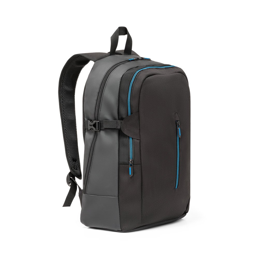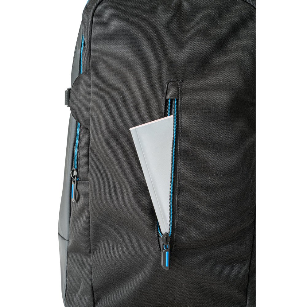 Mochila para notebook em 900D e c. sintético com 2 compartimentos principais e bolso frontal. O compartimento posterior é forrado e tem divisória almofadada para notebook até 15,6″ e bolso em tela, com zíper. O segundo compartimento também é forrado e contém diversos bolsos interiores. Parte posterior e alças almofadadas. Capacidade até 18 L