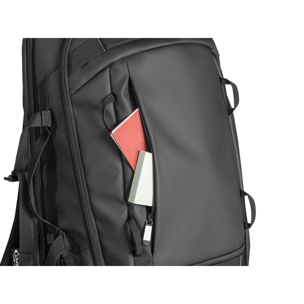 Mochila para notebook em poliéster reciclado 900D de alta densidade, com revestimento resistente à água, e forro em poliéster reciclado 210D. Possui 1 compartimento traseiro com divisória almofadada para notebook até 17.3″ e um bolso frontal com zíper. Contém parte posterior com acolchoamento extra, cintas de compressão removíveis na parte frontal da mochila e detalhes refletores nas pegas e alças. Capacidade até 21 L