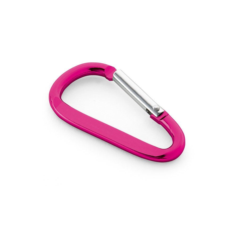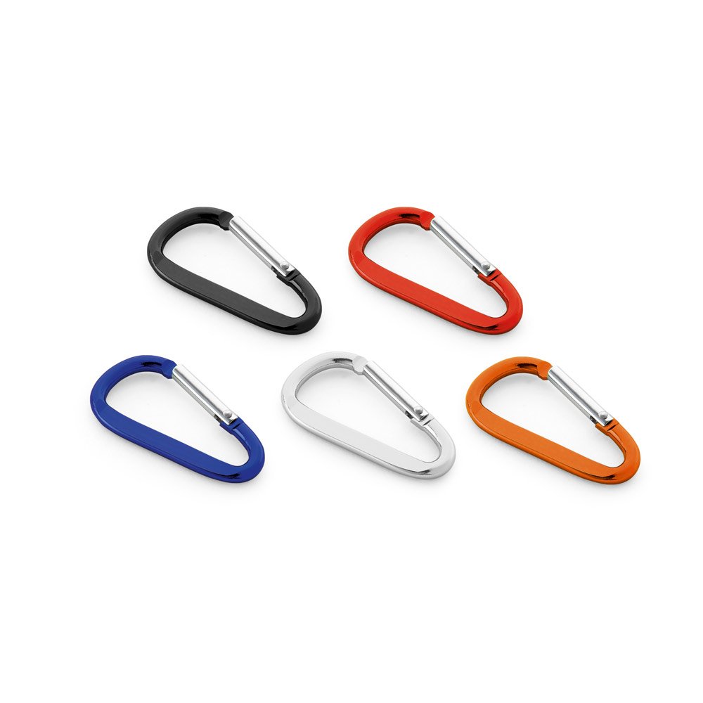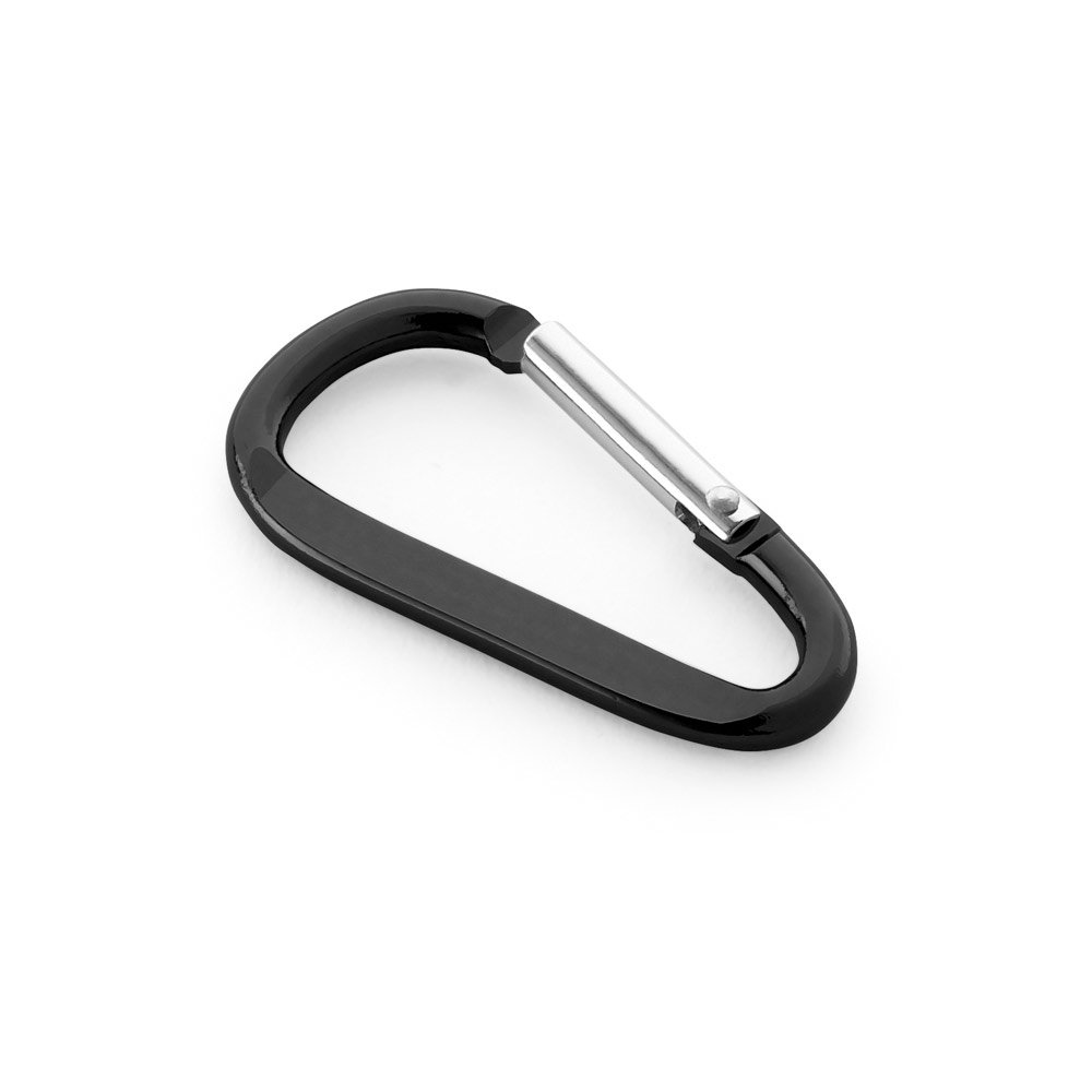 Mosquetão em alumínio com área plana para gravação. 24 x 48 x 4 mm