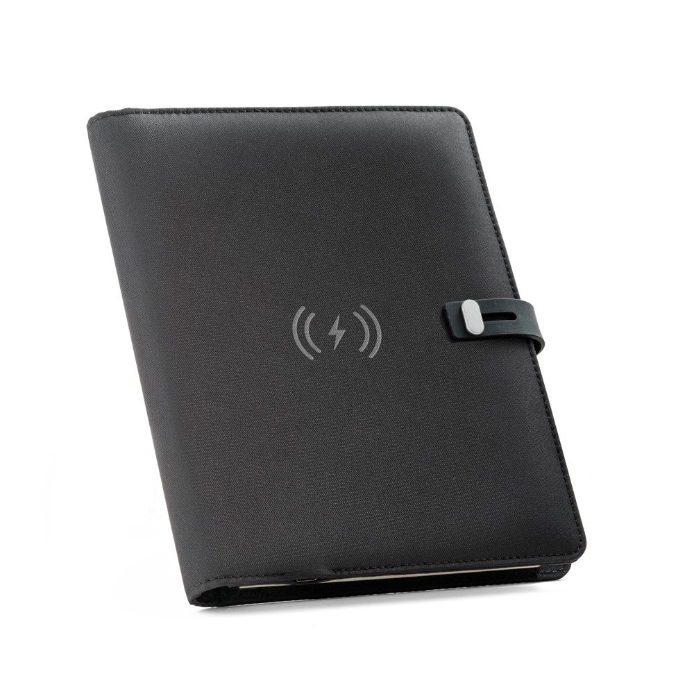 Pasta A5 em 300D poliéster 100% reciclado com carregador wireless embutido. A bateria tem capacidade para 5.000 mAh, potência de 10W, entrada/saída 5V/2.1A e cabo USB tipo C para carregar a bateria. A pasta contém no seu interior um bolso para smartphone até 6.5”, três espaços para cartões, quatro luzes LED, botão on/off, suportes para esferográfica (não inclusa), celular e cabo USB, um bloco de notas com capa em cartão preto e 128 páginas pautadas cor marfim, em papel proveniente de gestão florestal sustentável. Na frente existe ainda uma impressão oval em preto para indicar a área de carga do wireless. Fornecido em caixa presente