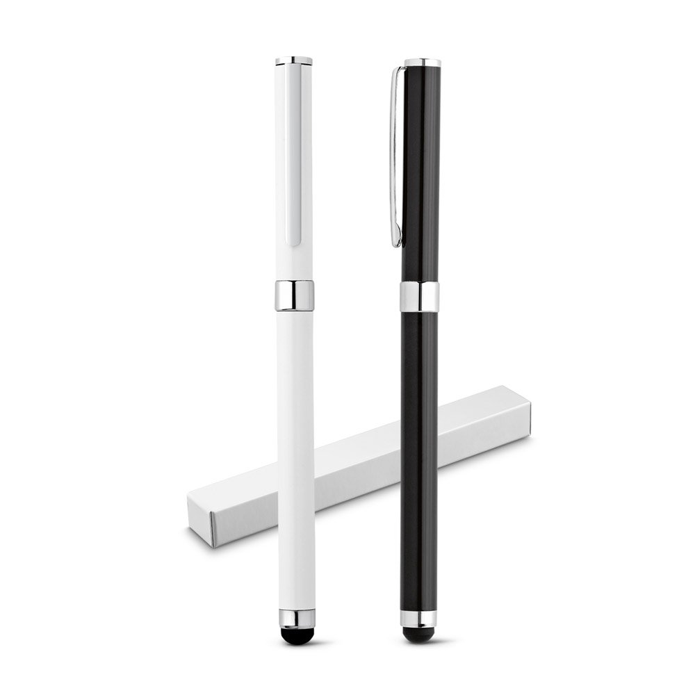 Roller em aço inoxidável com corpo brilhante e detalhes em metal cromado. O detalhe da ponteira touch torna este brinde sofisticado e adaptável às novas tecnologias. Escrita em preto. Fornecido com caixa presente desmontada