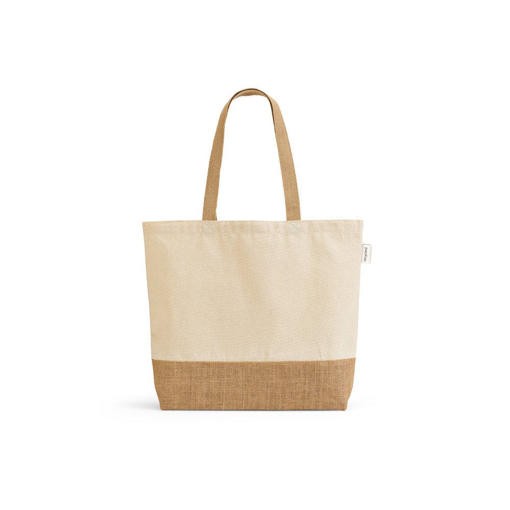 Sacola em 70% algodão reciclado e 30% poliéster reciclado (220 g/m²) com base em juta. Alças em webbing com 65 cm